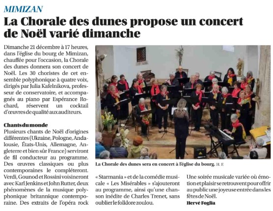 Elle donnera son concert de Noël dimanche 21 décembre à 17h à l’église de Mimizan Bourg.