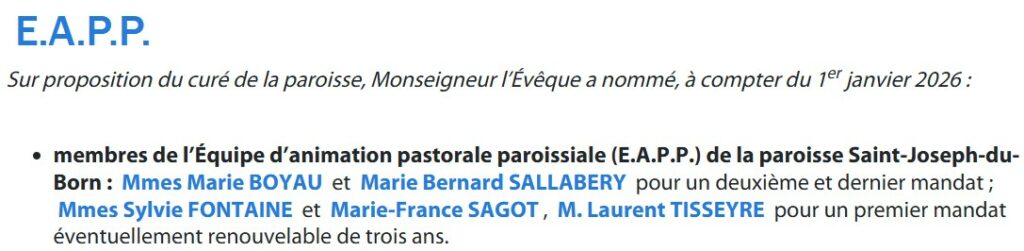 Le 18 janvier, Mgr Souchu a envoyé en mission la nouvelle Équipe d’animation pastorale paroissiale (EAPP) au cours de la messe de 10h30, à Mimizan Plage. Elle est composée de Marie Boyau et Marie Bernard Sallaberry (pour un second mandat) et de Sylvie Fontaine, Marie-France Sagot et Laurent Tisseyre (pour un premier mandat). Toutefois, la durée de l’envoi se terminera avec la mise en place de l’ensemble pastoral dans lequel notre paroisse appartiendra.