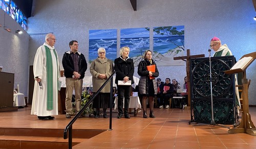 Le 18 janvier, Mgr Souchu a envoyé en mission la nouvelle Équipe d’animation pastorale paroissiale (EAPP) au cours de la messe de 10h30, à Mimizan Plage. Elle est composée de Marie Boyau (absente) et Marie Bernard Sallaberry (pour un second mandat) et de Sylvie Fontaine, Marie-France Sagot et Laurent Tisseyre (pour un premier mandat). Toutefois, la durée de l’envoi se terminera avec la mise en place de l’ensemble pastoral dans lequel notre paroisse appartiendra.