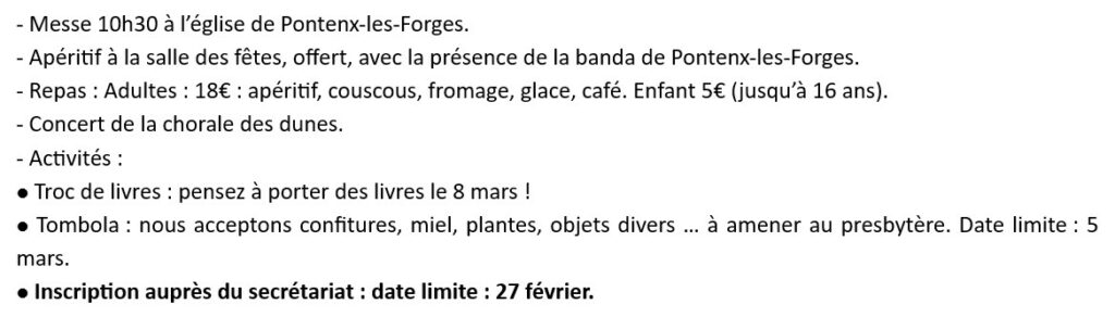 Les Amis de l’orgue de Mimizan tiendra son assemblée générale le samedi 28 février, à 10h, à la Maison paroissiale de Mimizan. Ordre du jour : A l’issue de l’assemblée générale, un verre d’amitié sera proposée. Contacts : Philippe Aurillac ( 06 80 64 84 71) – Annie Badetz (06 70 18 34 49) Adresses […]