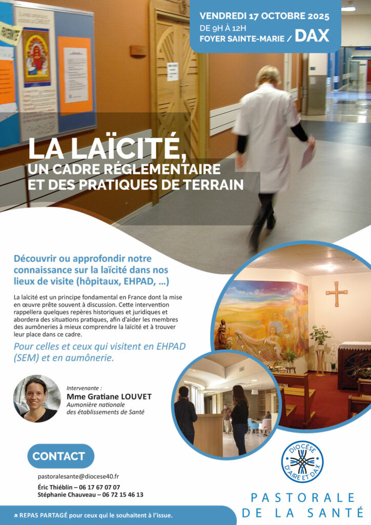 Le service diocésain de la Pastorale de la santé organise une rencontre le vendredi 17 octobre 2025, de 9h à 12h, au Foyer Sainte-Marie à Dax, pour découvrir ou approfondir notre connaissance sur la laïcité dans nos lieux de visite (hôpitaux, EHPAD, …).