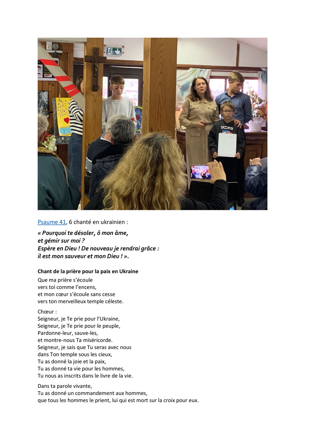 Toute la journée a été parsemée de prières et de chants, en langue allemande, ukrainienne et française, avec de temps à autre une traduction simultanée. Nous avons prié pour la paix en Ukraine et dans toutes les régions du monde affectées par les conflits et la guerre. Nous avons prié pour les 6000 jeunes allemands et français que les Pavillons de Bourricos accueillent et ont accueillis pendant leurs camps d’été depuis 45 ans, et avec tous les jeunes de la planète qui s’inquiètent pour leur avenir, pour la paix et le respect de la création, et qui expriment leurs doutes et leur foi.